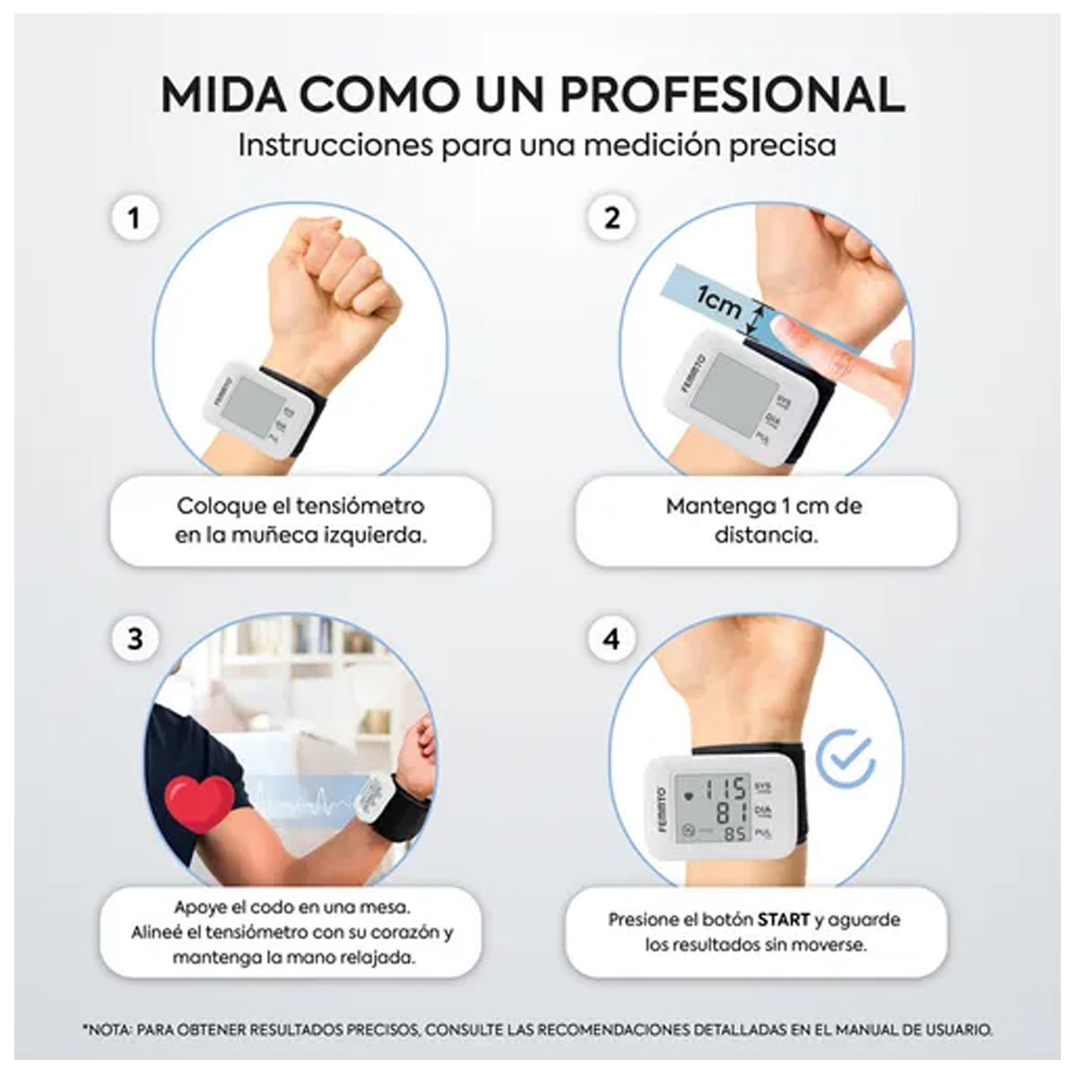 El tensiómetro de muñeca digital FEMMTO KF-75B se utiliza para medir la presión arterial y el pulso.